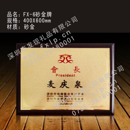 FX-6砂金奖牌是一种表面用激光雕刻,构图巧妙、工艺精湛的绿色环保奖牌,设计师们精心勾画出丰富多彩的文字和图案;以木板质地为主要依托,其它辅助性牌匾相互结合以后具有较强立体感,后面一般有支架,也可悬挂墙壁。适用于各种授权牌,特许牌,加盟牌等各类性质及场合。以上奖牌适用场合及适用项目仅供参考。