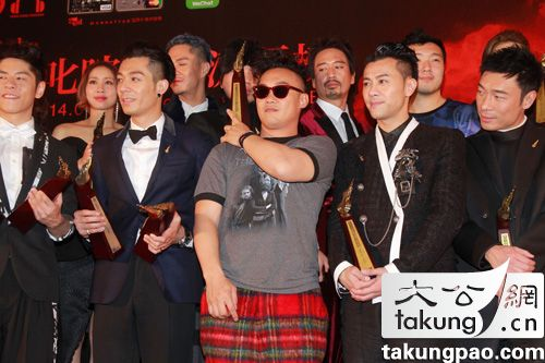 在庆功宴上,心情转好的Eason跟出席歌手拍摄大合照时,鬼马的他不停把玩手上“至尊唱片大奖”的